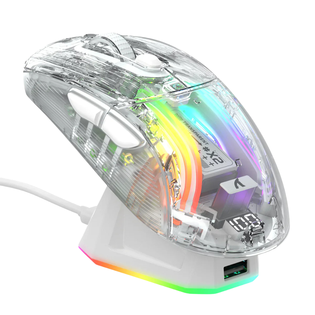 The ATTACK SHARK X2PRO is a versatile wireless gaming mouse with a transparent shell and magnetic charging dock. Featuring a PAW3212 sensor, tri-mode connectivity, and silent clicks, it offers an ergonomic design for comfortable gaming. Enjoy vibrant 3D RGB lighting and easily monitor battery levels.