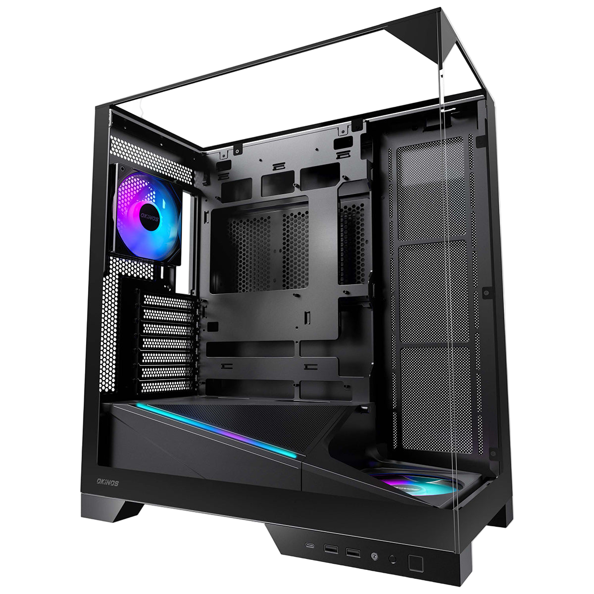 The Okinos Aqua 93 ARGB ATX Mid Tower features stunning three-side tempered glass, an elegant inclined PSU shroud with ARGB lighting, and two pre-installed PWM ARGB fans for dynamic cooling. With spacious cable management, versatile vertical GPU support, and easy-access cleaning features, Aqua 93 blends showcase-worthy style with functional innovation for the modern gaming build.