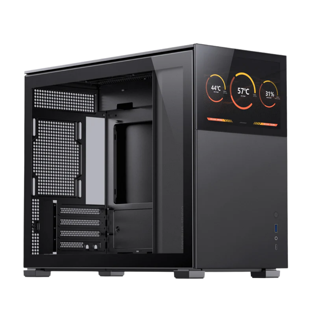 The D31 STD SCREEN Black is a compact 31.3 L mATX/ITX case with an integrated 8" 1280 × 800 TFT-LCD for real-time monitoring and custom visuals. It supports full-length GPUs, 168 mm coolers, and 360 mm radiators on top and bottom, providing strong performance and airflow in a sleek, small-footprint chassis with USB 3.2 Gen 2 Type‑C front I/O.