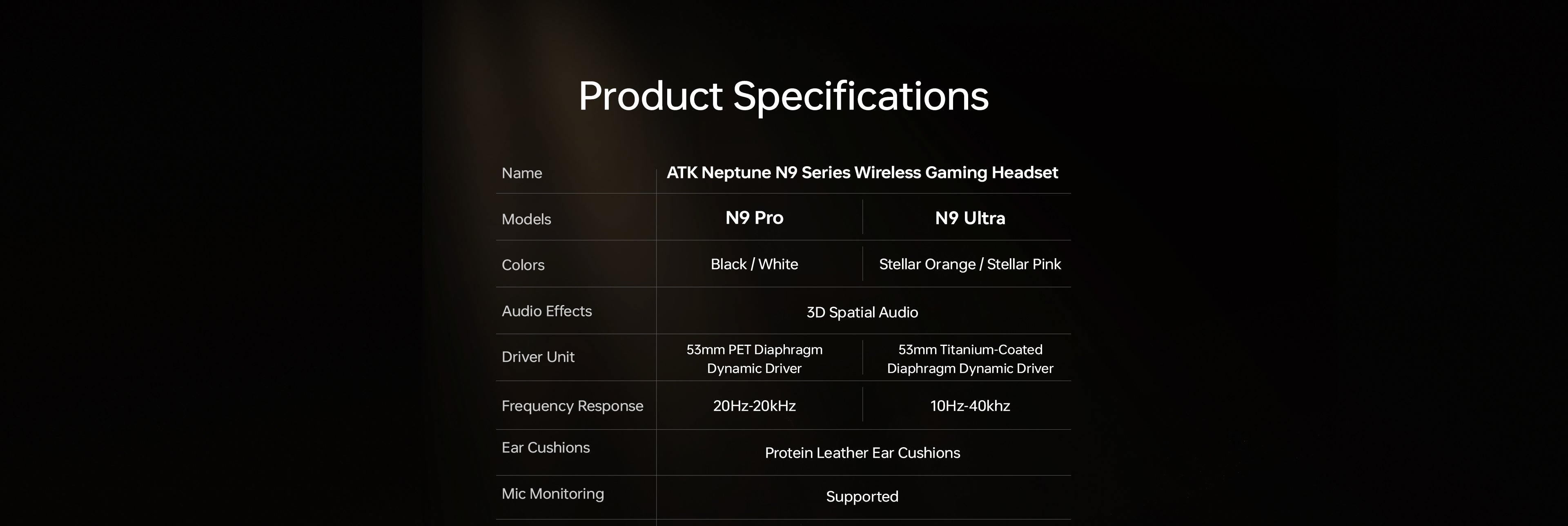 The ATK Neptune N9 Ultra wireless gaming headset pairs immersive 3D spatial audio with powerful 53mm titanium-coated drivers, delivering a broad 10Hz–40kHz frequency range for lifelike sound. Featuring plush protein leather ear cushions and mic monitoring, the N9 Ultra is designed for comfort, clarity, and standout style in Stellar Orange or Stellar Pink.