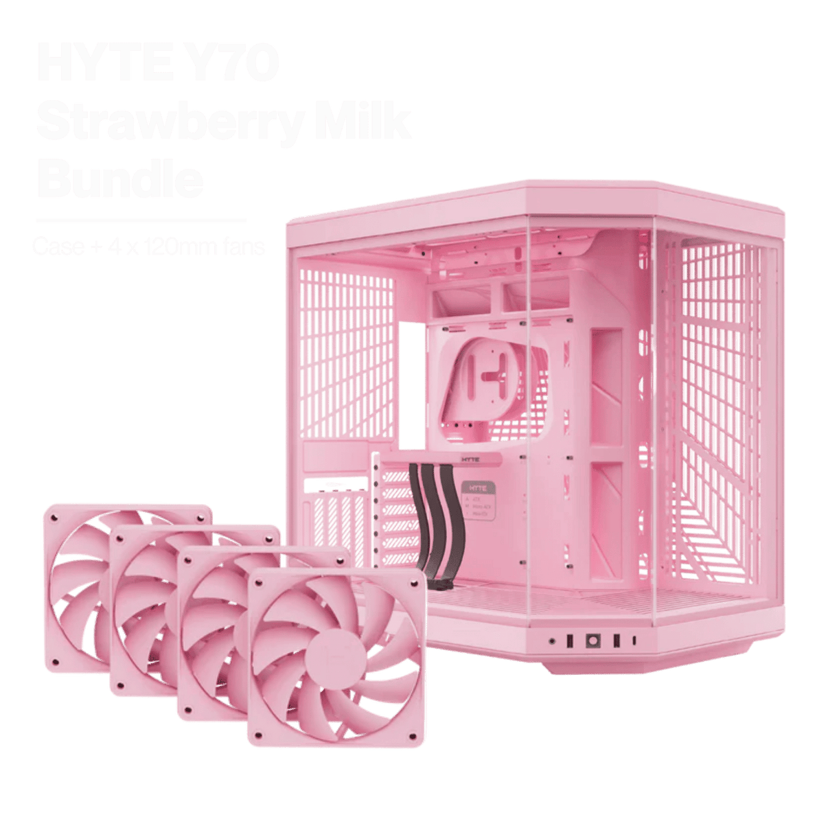 Turn your setup into a Strawberry Milk showpiece. This exclusive bundle pairs the Hyte Y70 (Strawberry Milk) dual‑chamber ATX case with a matching Hyte FA12 120mm 4‑Pack (Strawberry Milk), giving you everything you need for a clean, high‑airflow showcase build with perfectly coordinated aesthetics.