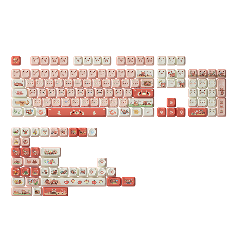 These MAO Profile Dye-sublimation Keycaps, inspired by a charming raccoon design, offer a unique cat-ear shaped profile for a distinct typing feel. Made from durable PBT with advanced 5-sided dye-sublimation, their vibrant legends resist fading. Compatible with a wide range of major-sized keyboards, they provide both aesthetic appeal and long-lasting quality.