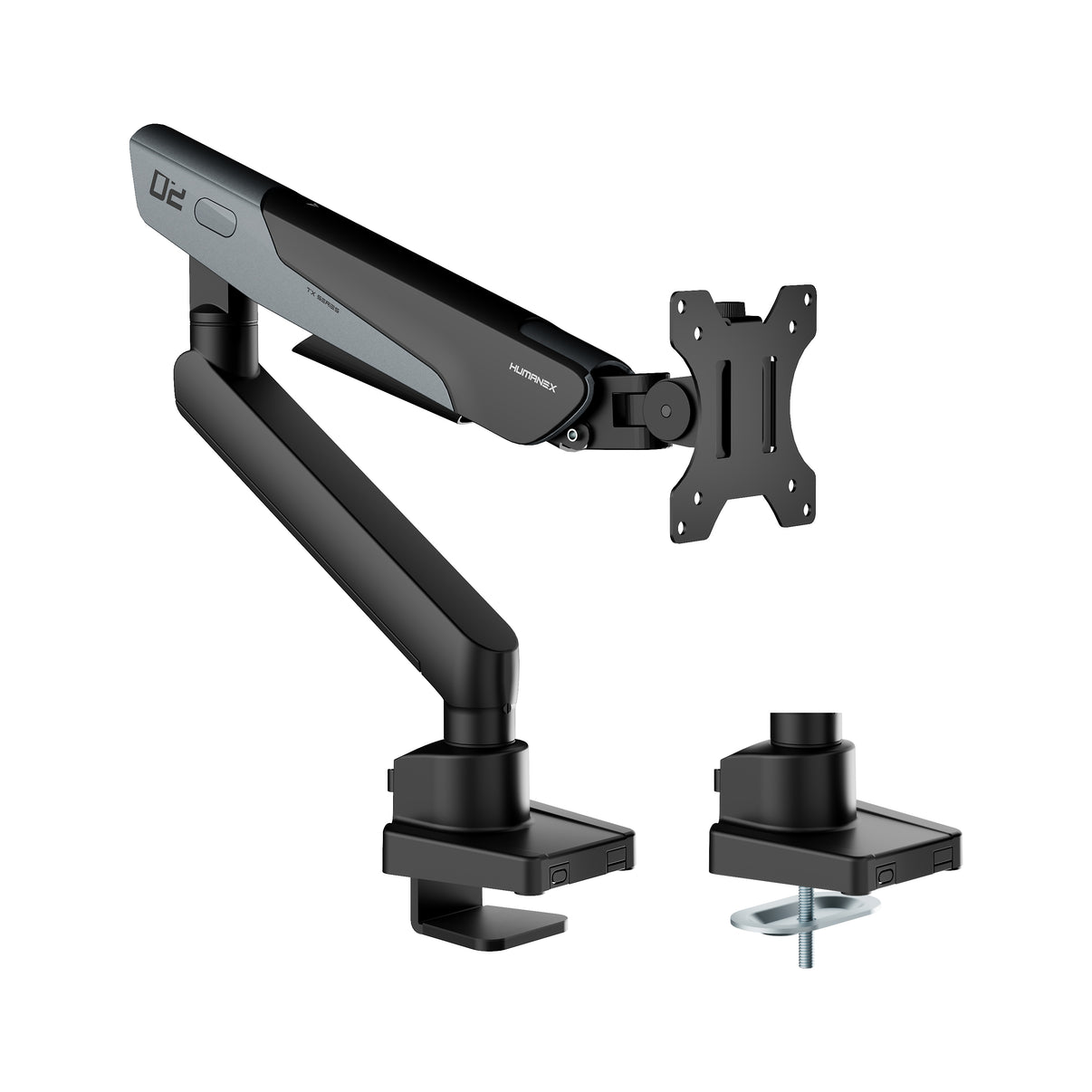 Humanex TX02-1G Single Arm supports 17" to 40" monitors weighing 2 to 12 kg. It offers full motion adjustability with tilt, swivel, and 180° rotation. Features a quick-release VESA plate, dual desk clamp and grommet mounting options, plus integrated cable management for a tidy workspace.