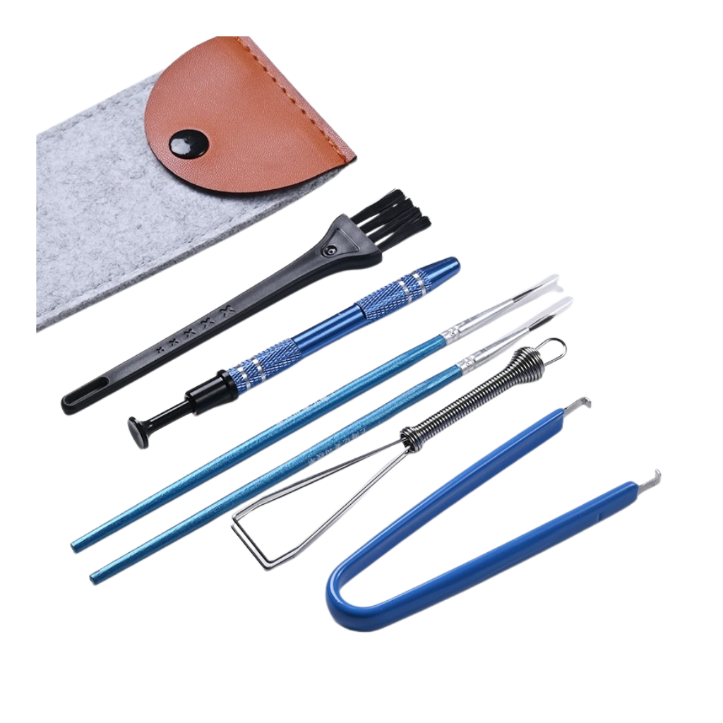 Carrying Case, 2 x Fine tip brushes, Switch Puller, Keycap Puller, Cleaning brush, Stem Holder